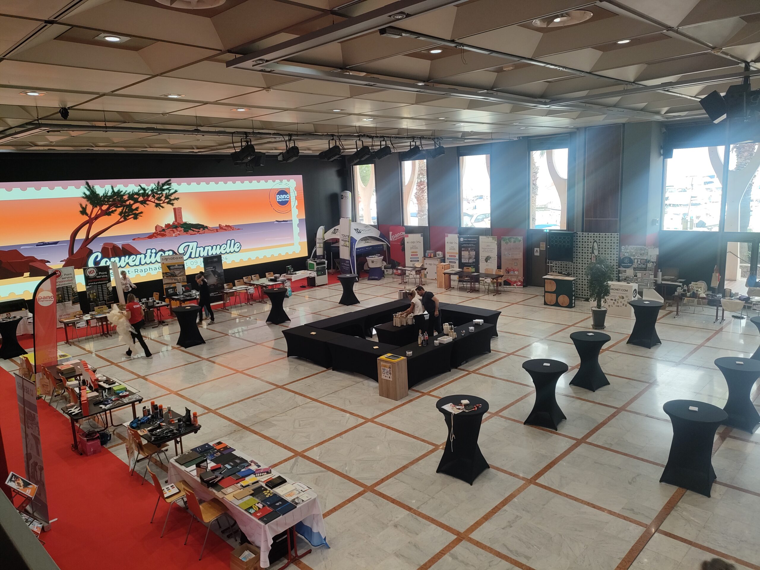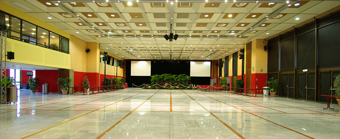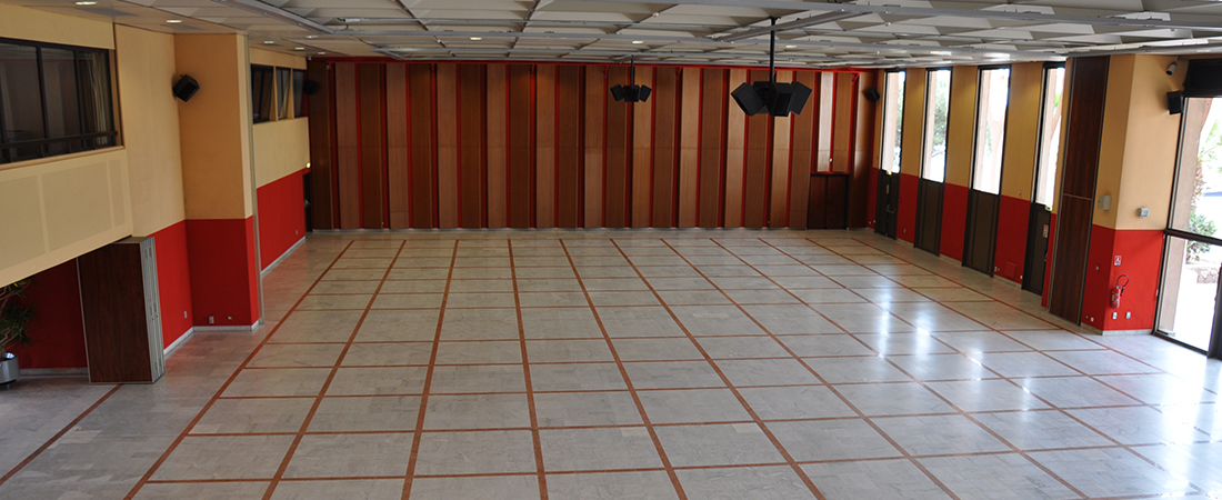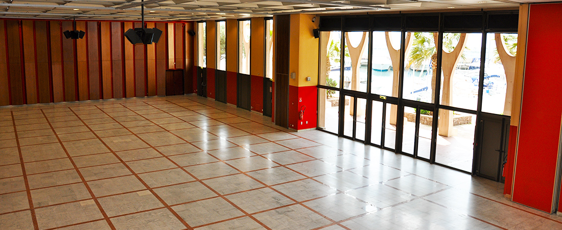 Salle de 680m² de plain pied, s’ouvrant directement sur le port de plaisance, sans pilier, modulable par un système de cloisons isophoniques , sol de marbre, 6m de hauteur sous plafond, rideaux d’occultation, Régie son pour allocutions, accès wifi.Hall d’entrée de 180m², avec banques d’accueil amovibles, vestiaire, espace bar.