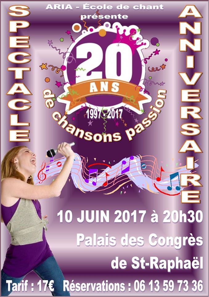 Les billets sont à commander obligatoirement au 06 13 59 73 36, puis à retirer, à partir du lundi 15 mai, au local d’ ARIA – Ecole de chant (213, Rue de la Soleillette à St-Raphaël, 1er étage tout au fond du couloir).