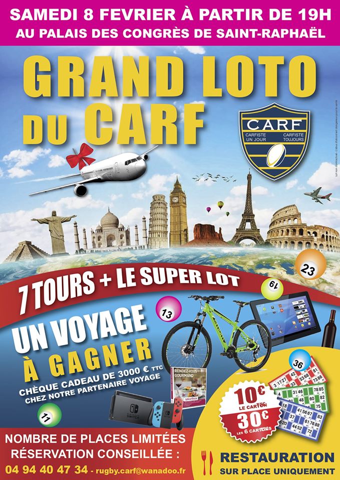 Comme chaque année le CARF organise son grand loto annuel, le samedi 8 février au Palais des Congrès de Saint-Raphaël. Au programme : 7 tours avec de très